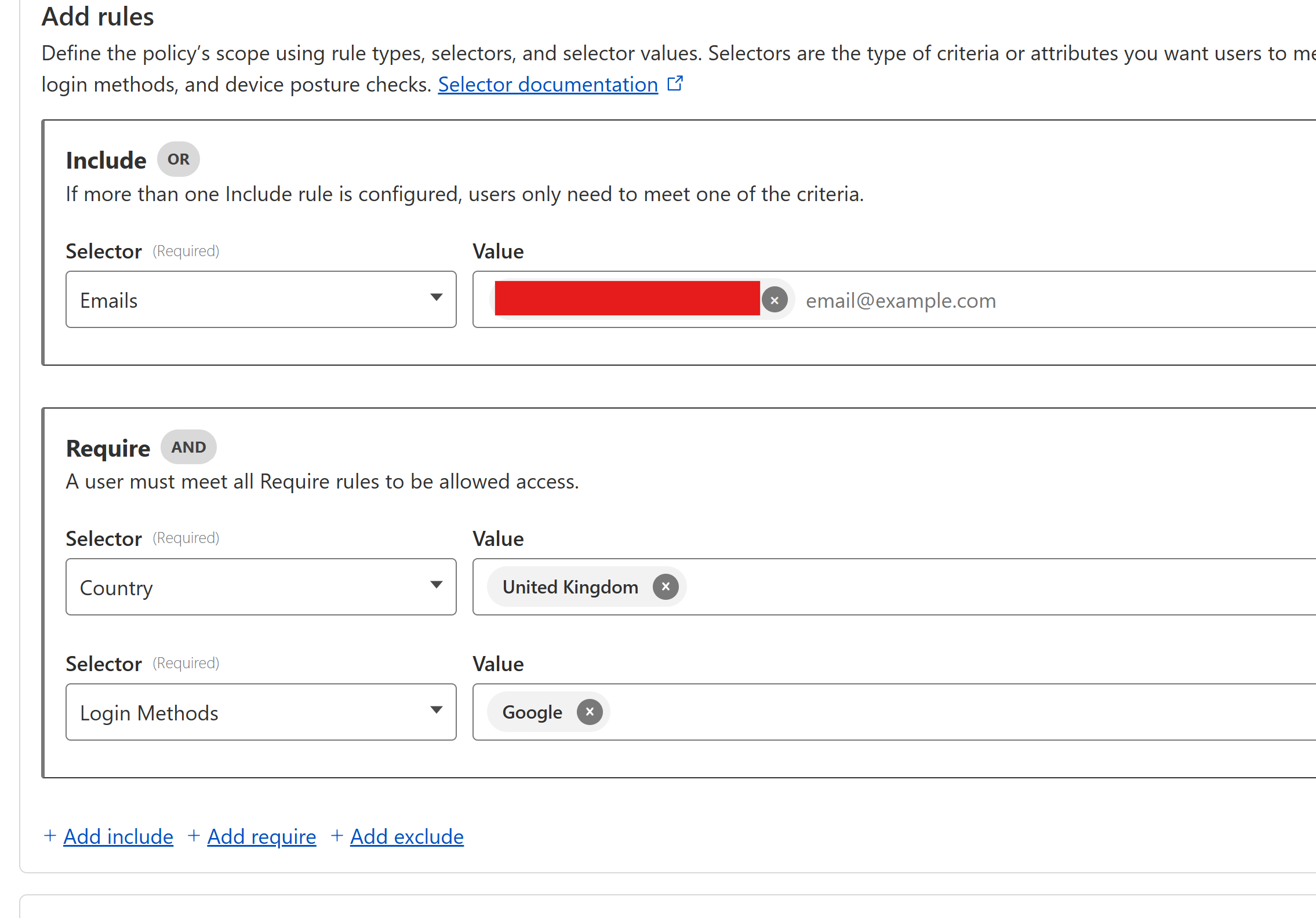- Require → Country - set to your country; Login Methods - choose your newly added Google login method.